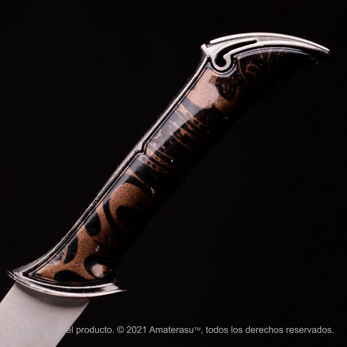 La empuñadura metálica con componentes de ABS, junto con su vaina a juego, garantiza una presentación firme y cuidada. Los detalles decorativos en aleación de zinc aportan textura y definición visual, reforzando su identidad como pieza de colección.