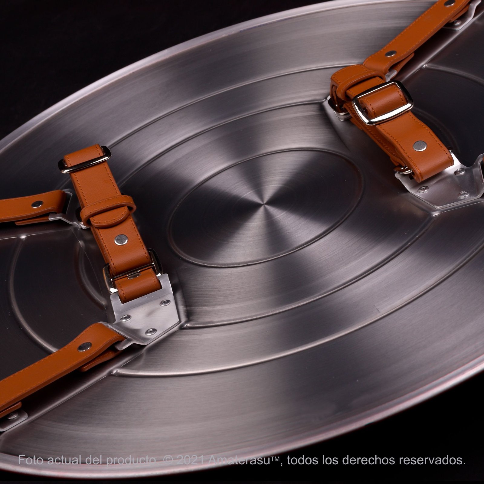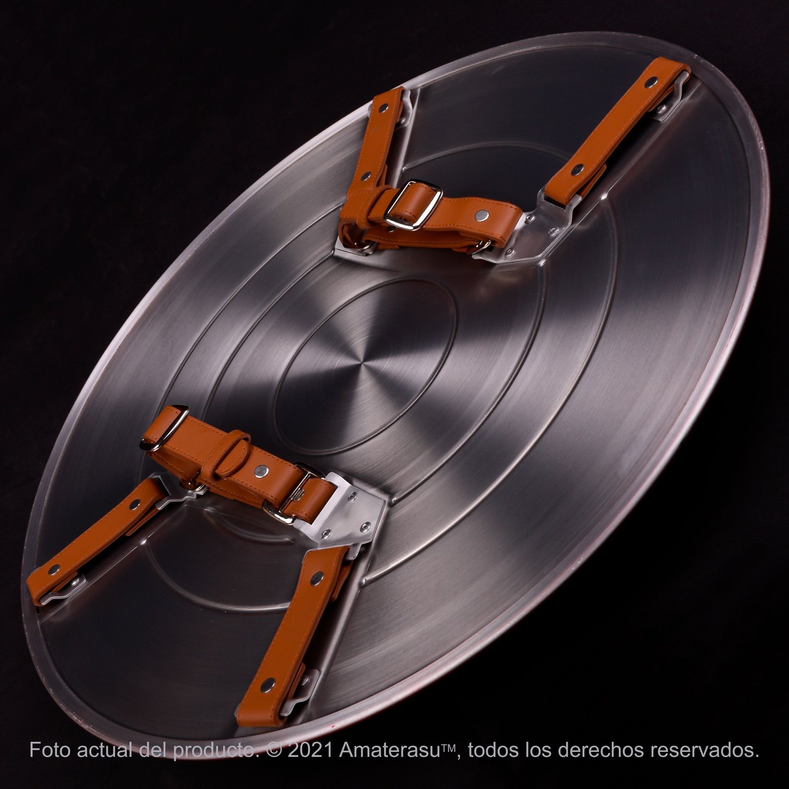 Aunque fabricado mediante técnicas artesanales modernas para lograr este nivel de detalle, el escudo se siente contundente y auténtico al tacto. La superficie extremadamente brillante presenta un acabado quasi-espejo en los anillos rojos y azul, logrado con un tratamiento anticorrosión y pintura automotriz premium. En el reverso, un sistema de correas de cuero marrón de plena flor está diseñado para soportar el peso y resistir un uso intenso durante sesiones fotográficas o exhibiciones.