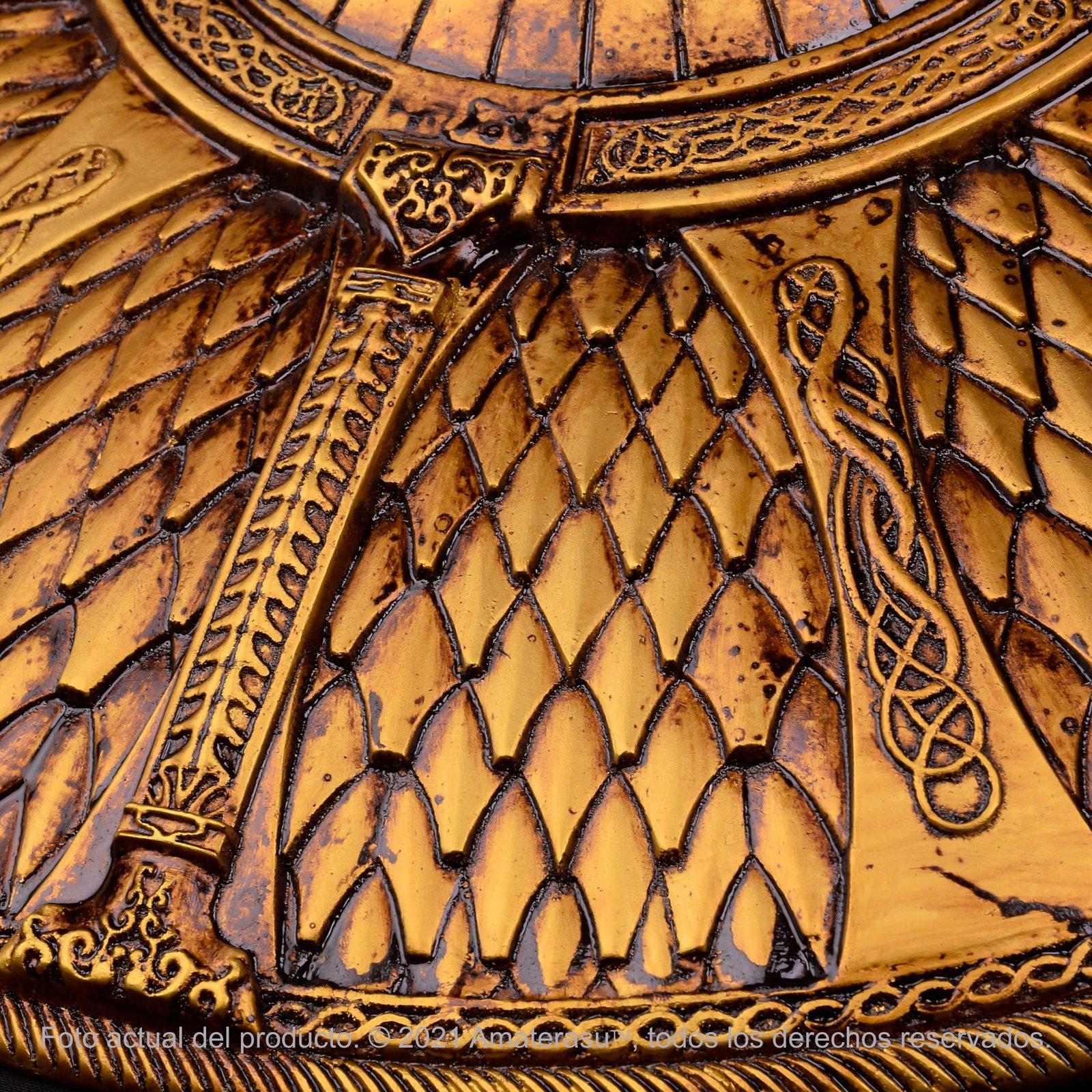 Esta recreación traslada ese concepto a una pieza de colección de gran presencia visual. El escudo está construido en resina reforzada con fibra de vidrio, lo que permite obtener buena rigidez estructural sin un peso excesivo para su tamaño.