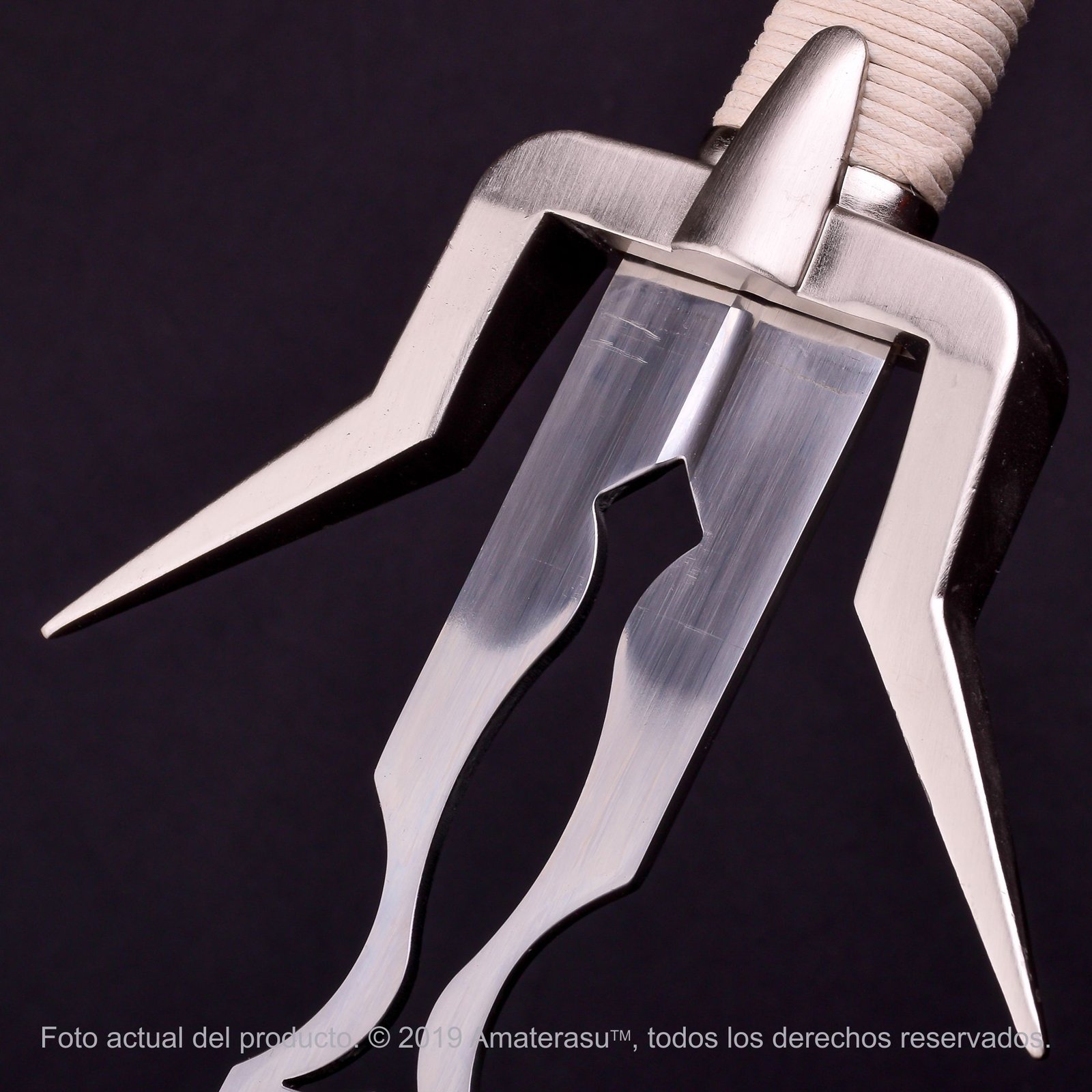 El diseño de la hoja, larga y estilizada, transmite ligereza visual y fluidez, alineándose con el estilo de combate ágil de Ciri. Fabricada en acero inoxidable, ofrece una presencia limpia y uniforme, ideal para exhibición prolongada sin requerimientos intensivos de mantenimiento.