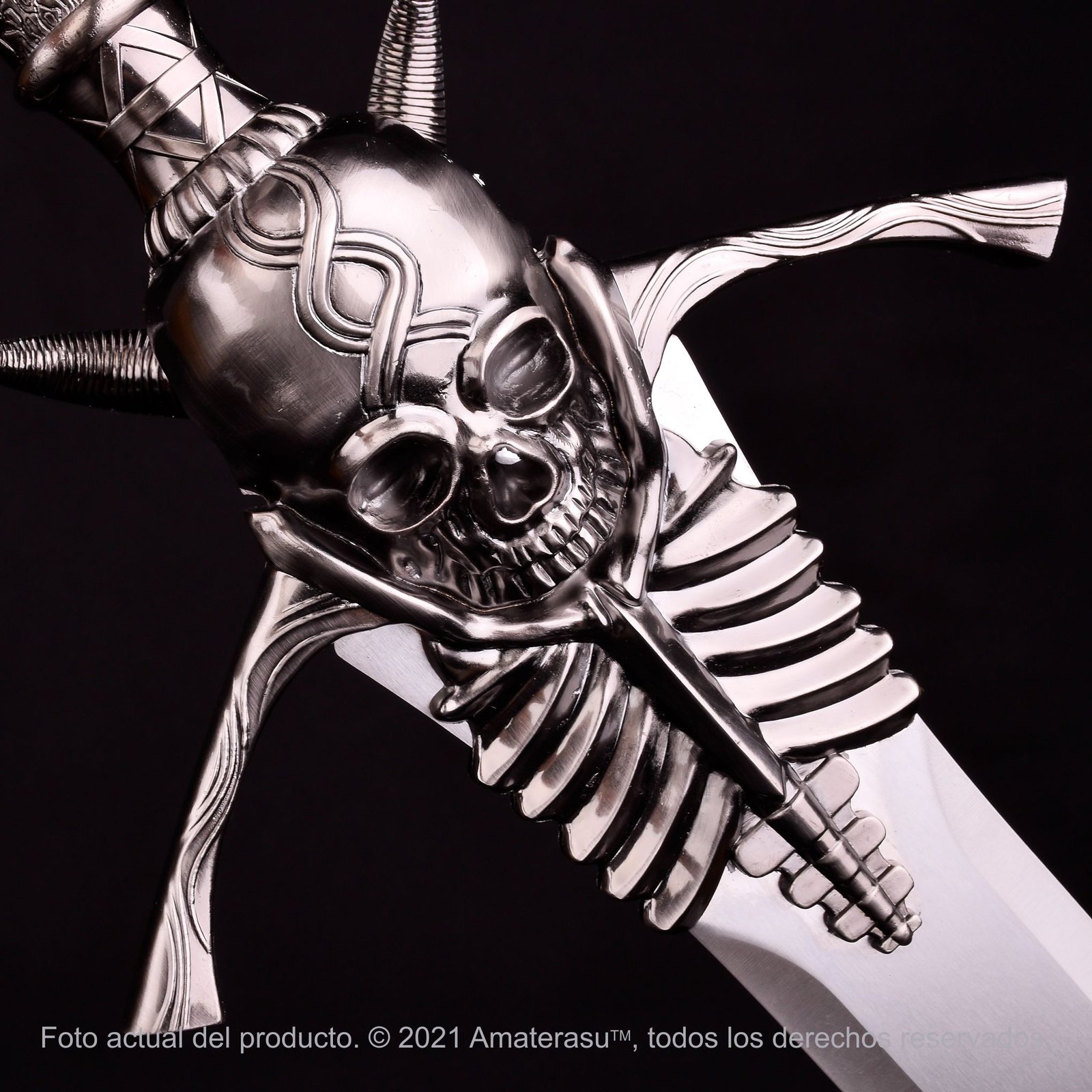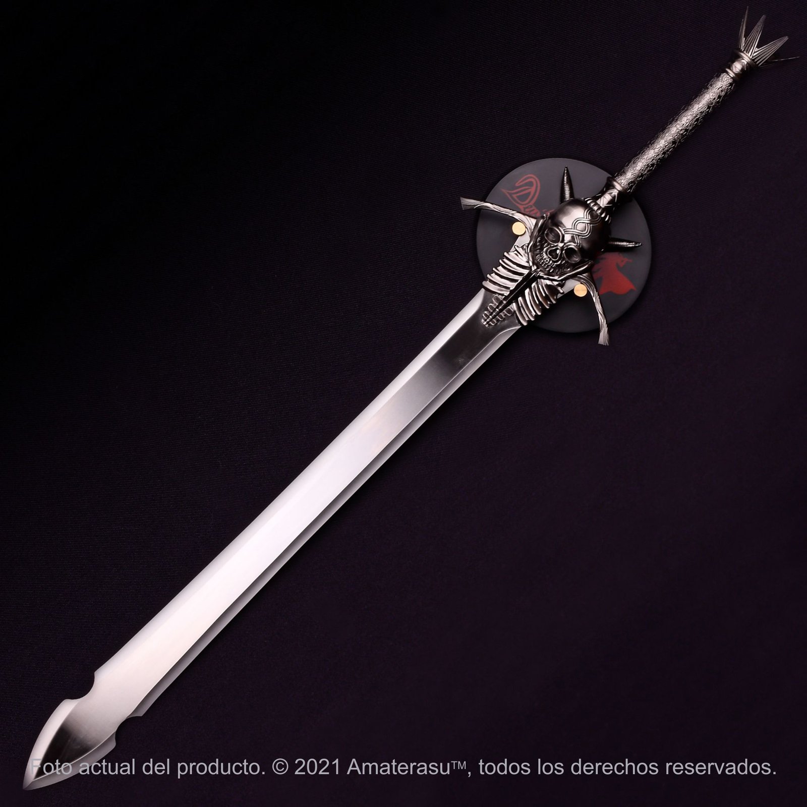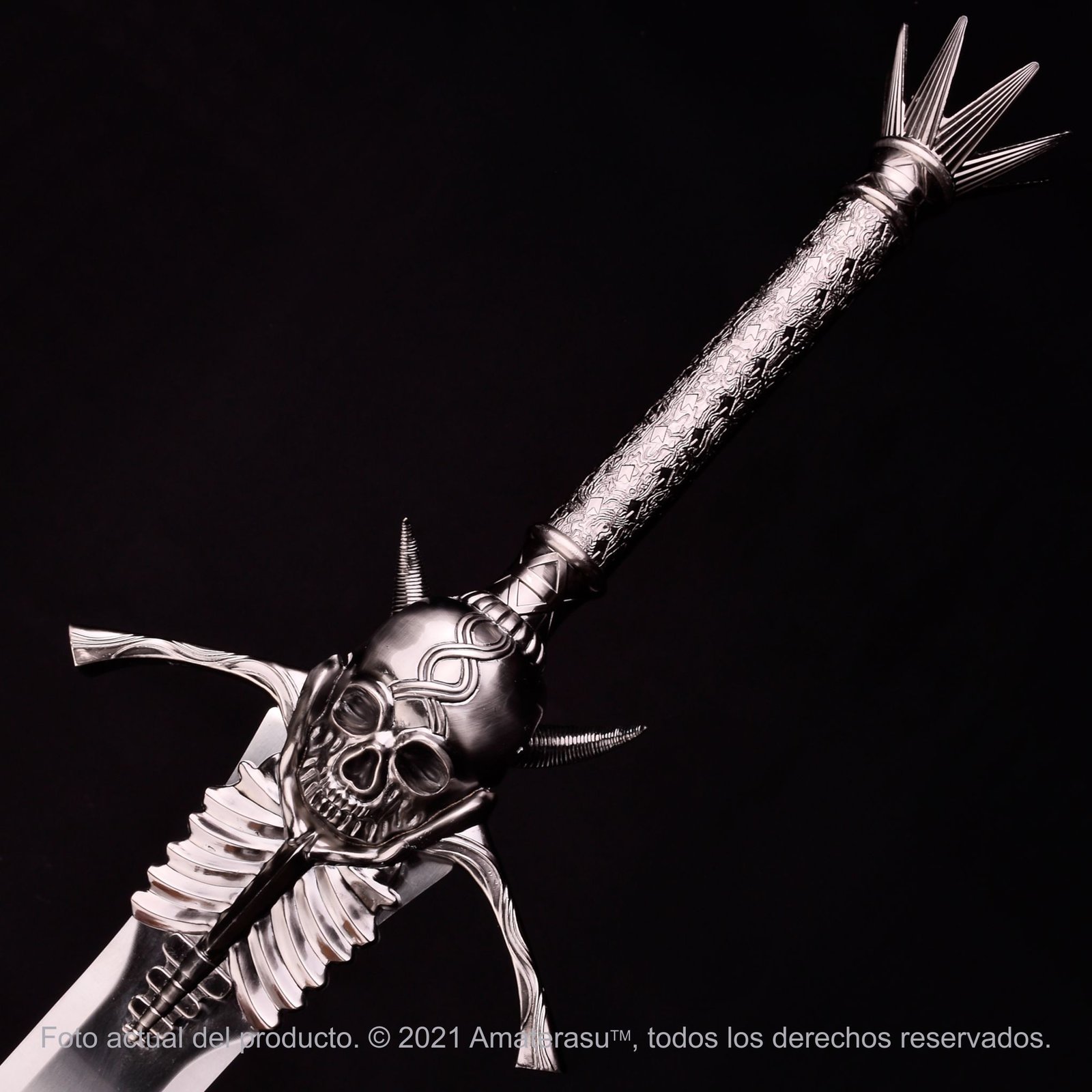 El trabajo de fundición en la guarda es exquisito: presenta el icónico cráneo con las cuencas profundas y las costillas que se extienden hacia la hoja, todo fabricado en aleación de zinc de alta densidad con un acabado envejecido. La empuñadura texturizada remata en un pomo con forma de corona de espinas, completando una estética gótica que es pura identidad de Devil May Cry.