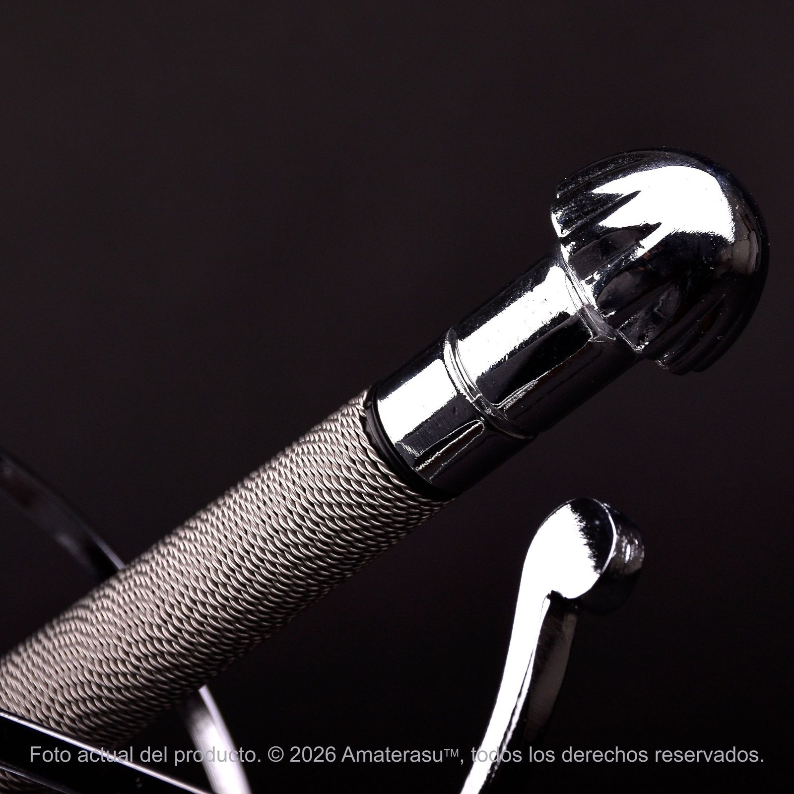 La empuñadura es una obra de artesanía por derecho propio, revestida con alambre trenzado de acero inoxidable que proporciona una textura táctil superior y un brillo metálico constante. La hoja, extremadamente esbelta con solo 1,8 cm de ancho, se extiende a lo largo de 94 cm en acero inoxidable 440 pulido espejo, logrando esa silueta icónica de «estoque» que definió una era.