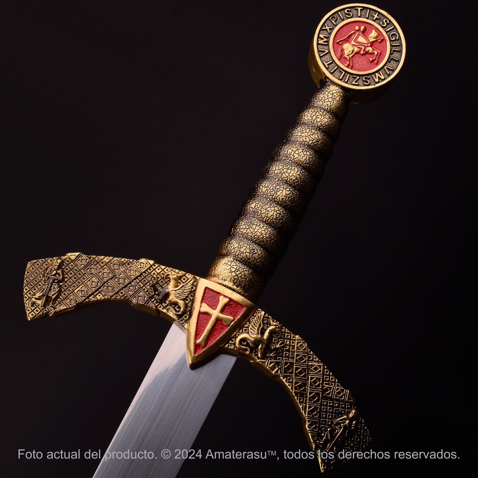 La Espada Templaria de Amaterasu recrea con fidelidad la estética de los monjes guerreros. Su característica más distintiva es el pomo circular en aleación de zinc, que exhibe el Sigillum Militum Xpisti: el icónico sello que muestra a dos caballeros compartiendo una montura como símbolo de su voto de pobreza y fraternidad.