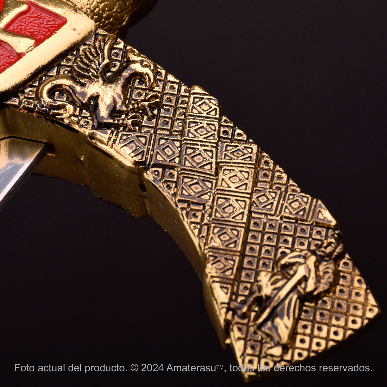 • Empuñadura, Pomo y Guarda: Aleación de Zinc con detalles en relieve y esmalte rojo.