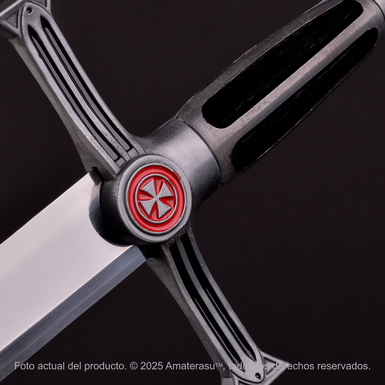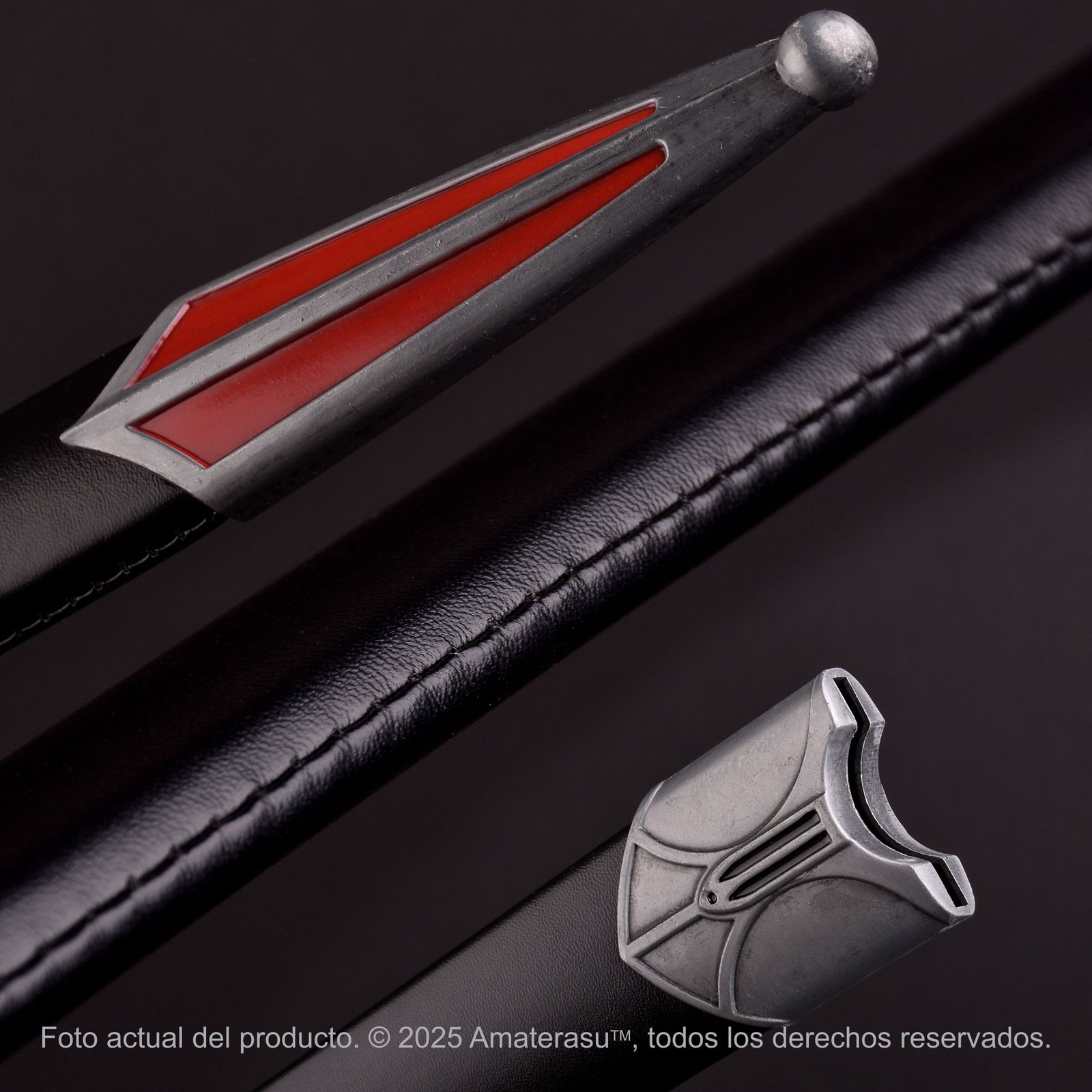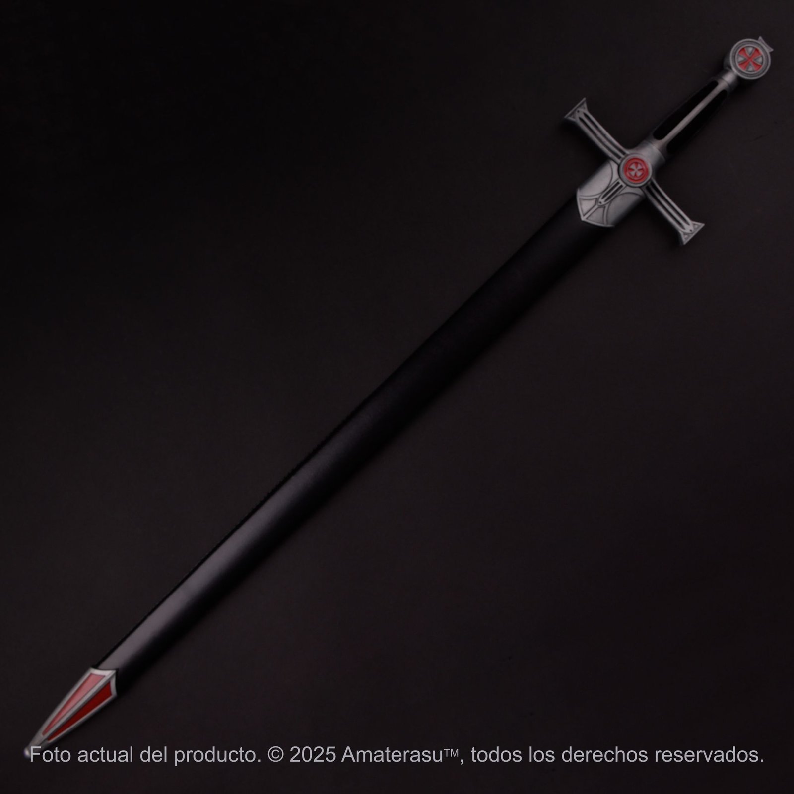 Lo que define a esta pieza son sus acabados. La Cruz Patada roja está presente en el pomo circular y en el centro de la guarda, coordinando perfectamente con los apliques de la contera en la vaina. La vaina de cuero ecológico negro completa un conjunto sobrio pero imponente, asegurando que la pieza sea el centro de todas las miradas tanto al cinto como en una vitrina de honor.