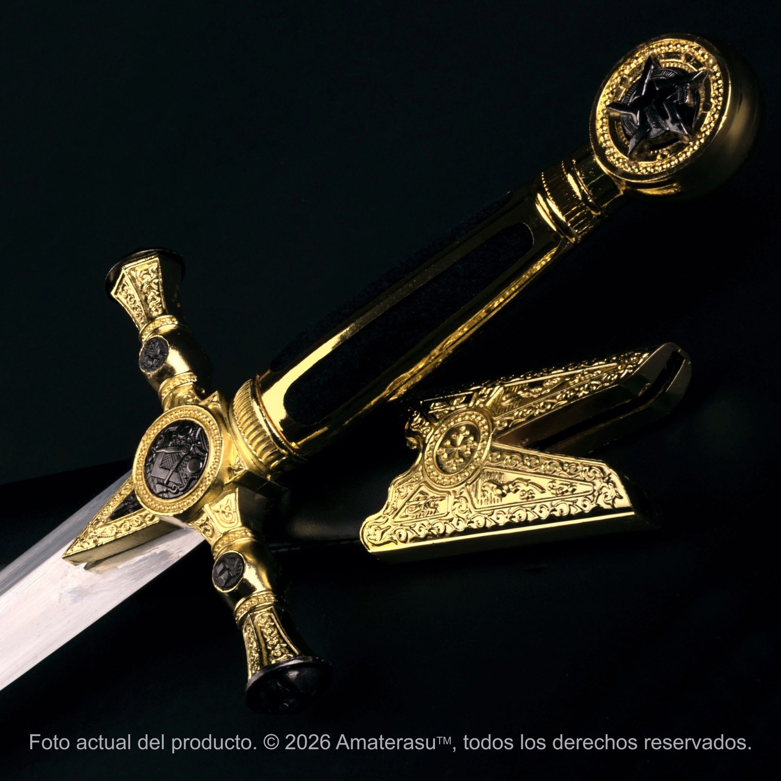 Cada relieve en el pomo y la guarda ha sido proyectado para reflejar la heráldica de la Orden. Desde los acabados en aleación de zinc hasta el diseño del brocal, la pieza respira solemnidad. La vaina de polímero revestida en cuero ecológico no solo protege el acero, sino que añade un nivel de detalle artesanal con sus aplicaciones metálicas, asegurando que la pieza luzca impecable al cinturón o en exhibición.