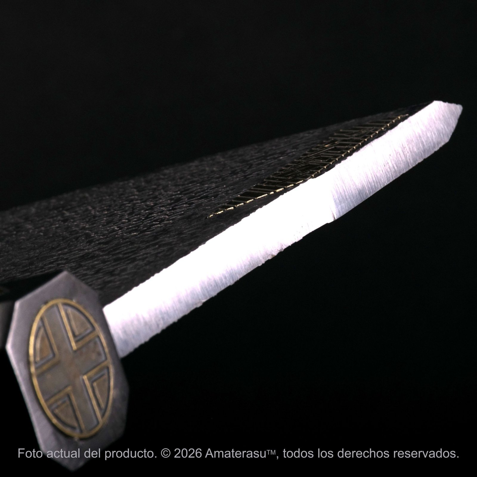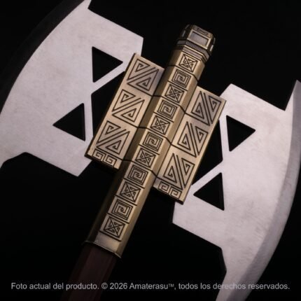 Atención: Esta es una pieza metálica pesada (3 kg). Su manipulación debe ser cuidadosa y responsable. No es un juguete ni está diseñada para el combate o impacto. Se recomienda instalar la panoplia en paredes firmes debido al peso del conjunto. Amaterasu comercializa este artículo exclusivamente como pieza de colección y exhibición.