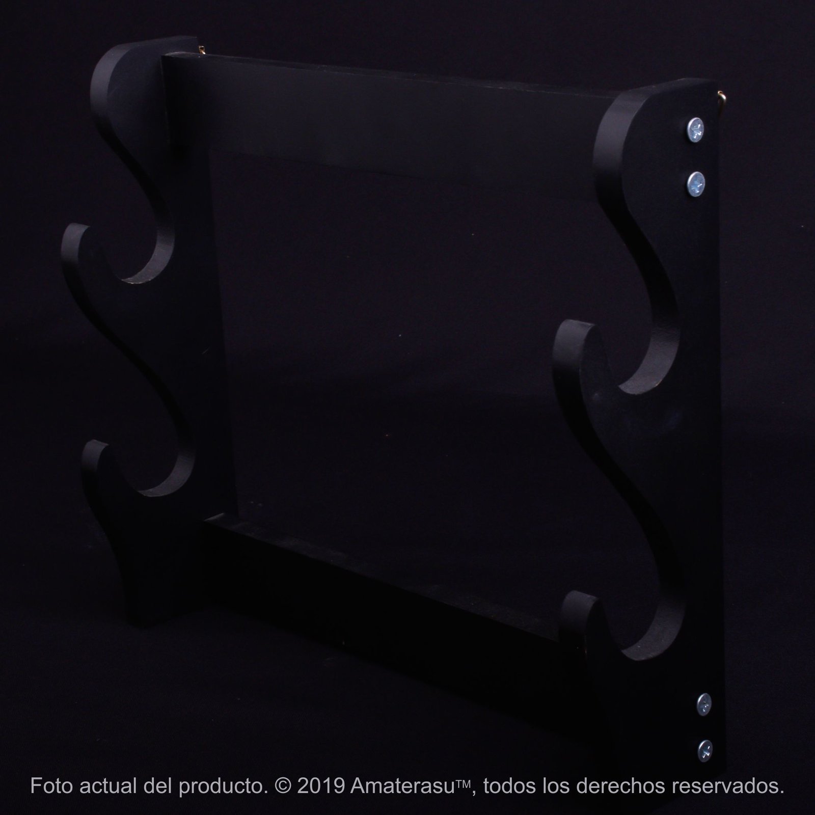 Soporte doble de pared para exhibir dos katanas. Fabricado en madera negro mate, con tornillos incluidos. Diseño sobrio para una exhibición equilibrada.