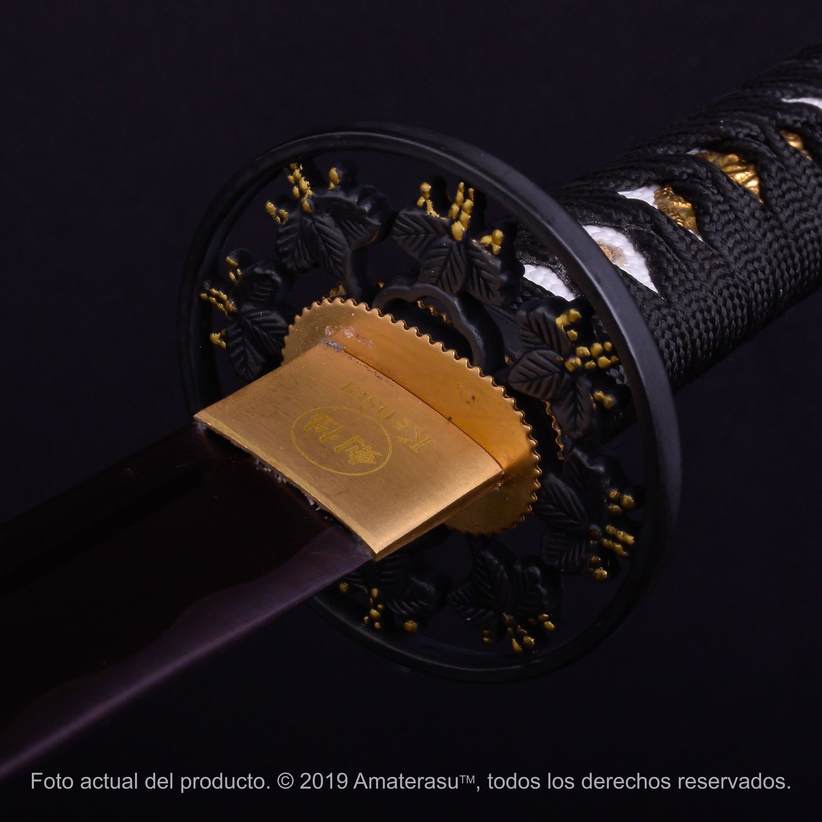 El conjunto se complementa con una tsuka clásica de madera dura con same ecológico e ito de seda ecológica, y accesorios en latón y aleación, manteniendo una estética sobria que permite que el verdadero protagonista sea el color singular de la hoja.