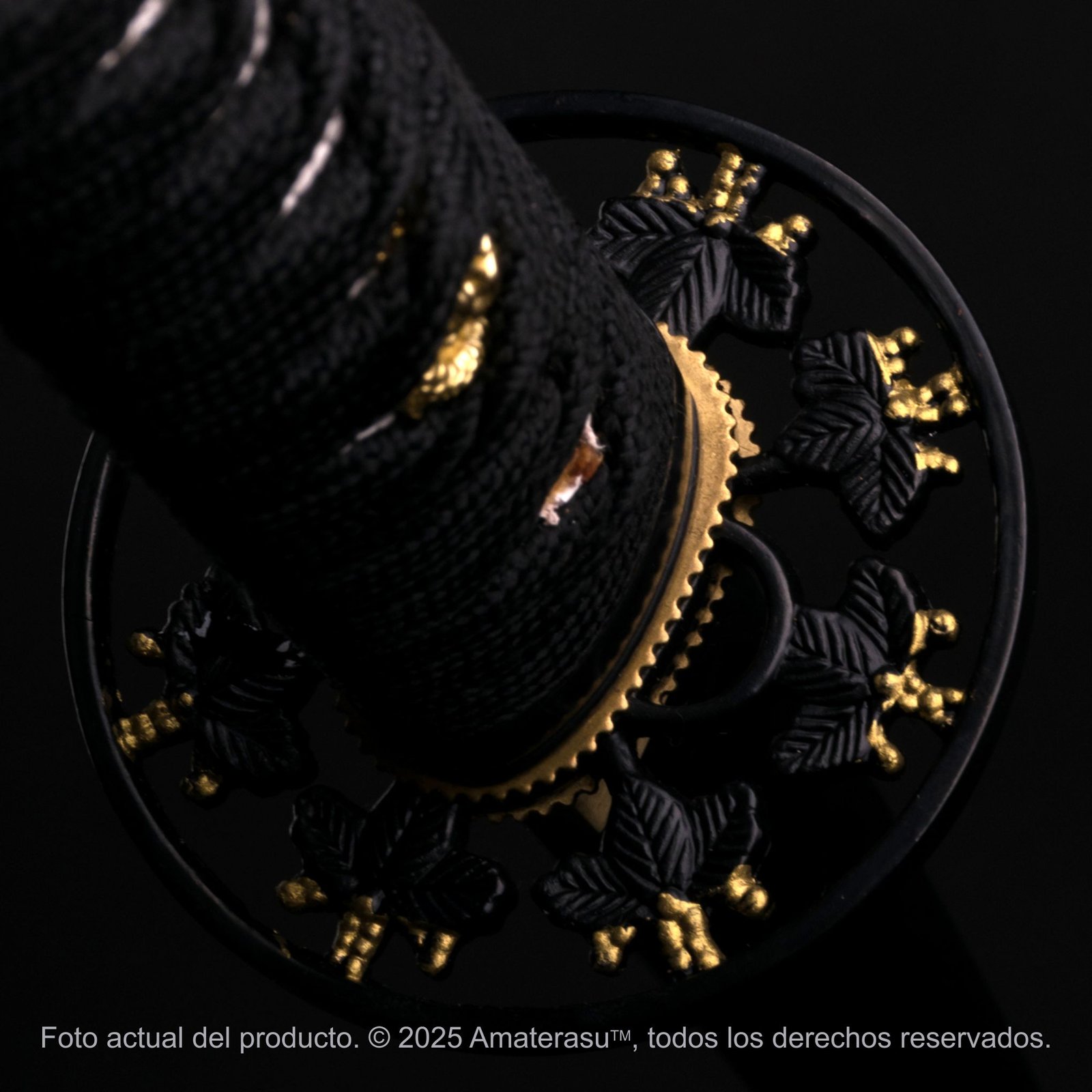 La tsuka en tonos oscuros, con same ecológico e ito de seda ecológica, acompaña la composición general sin competir con el protagonismo visual de la hoja y la saya.