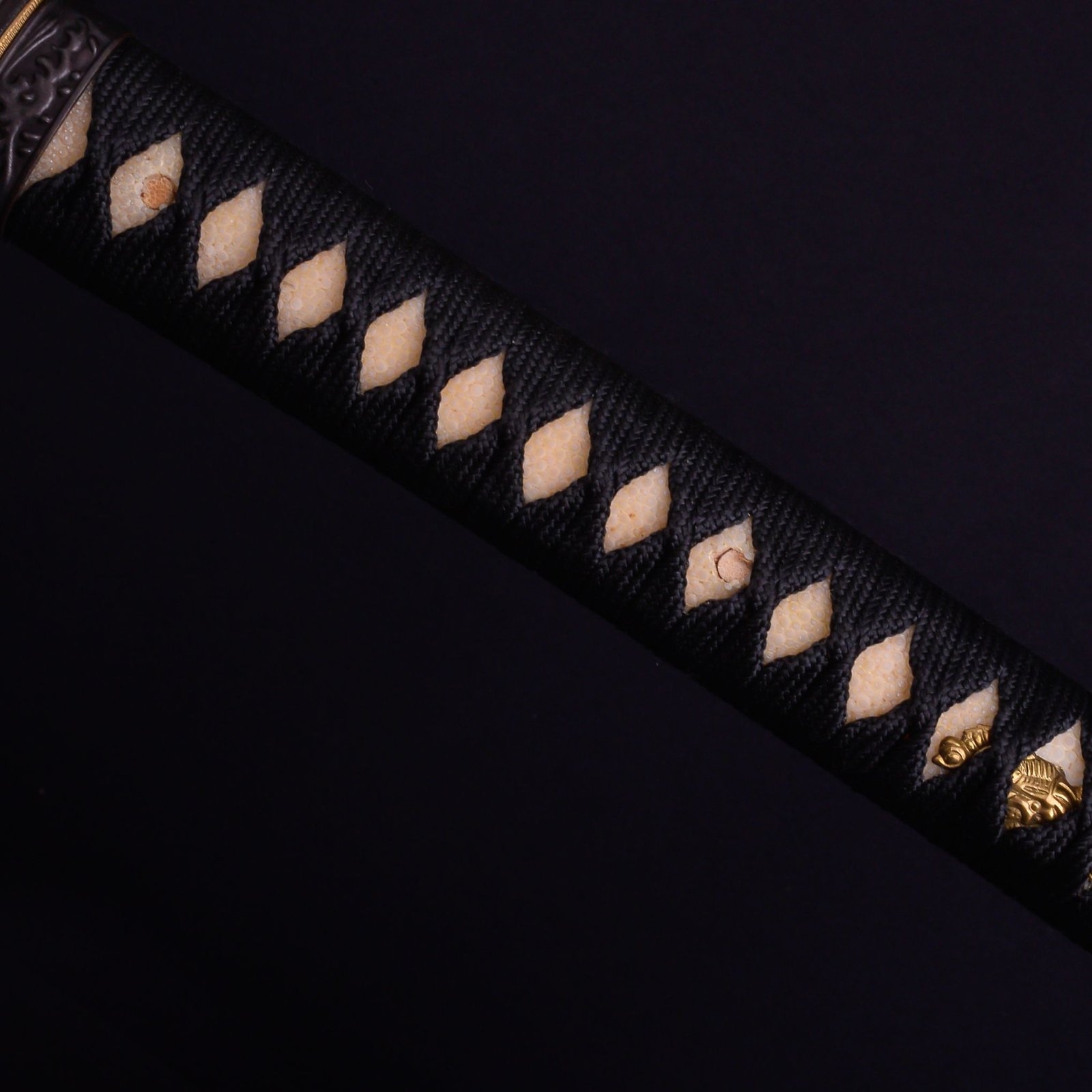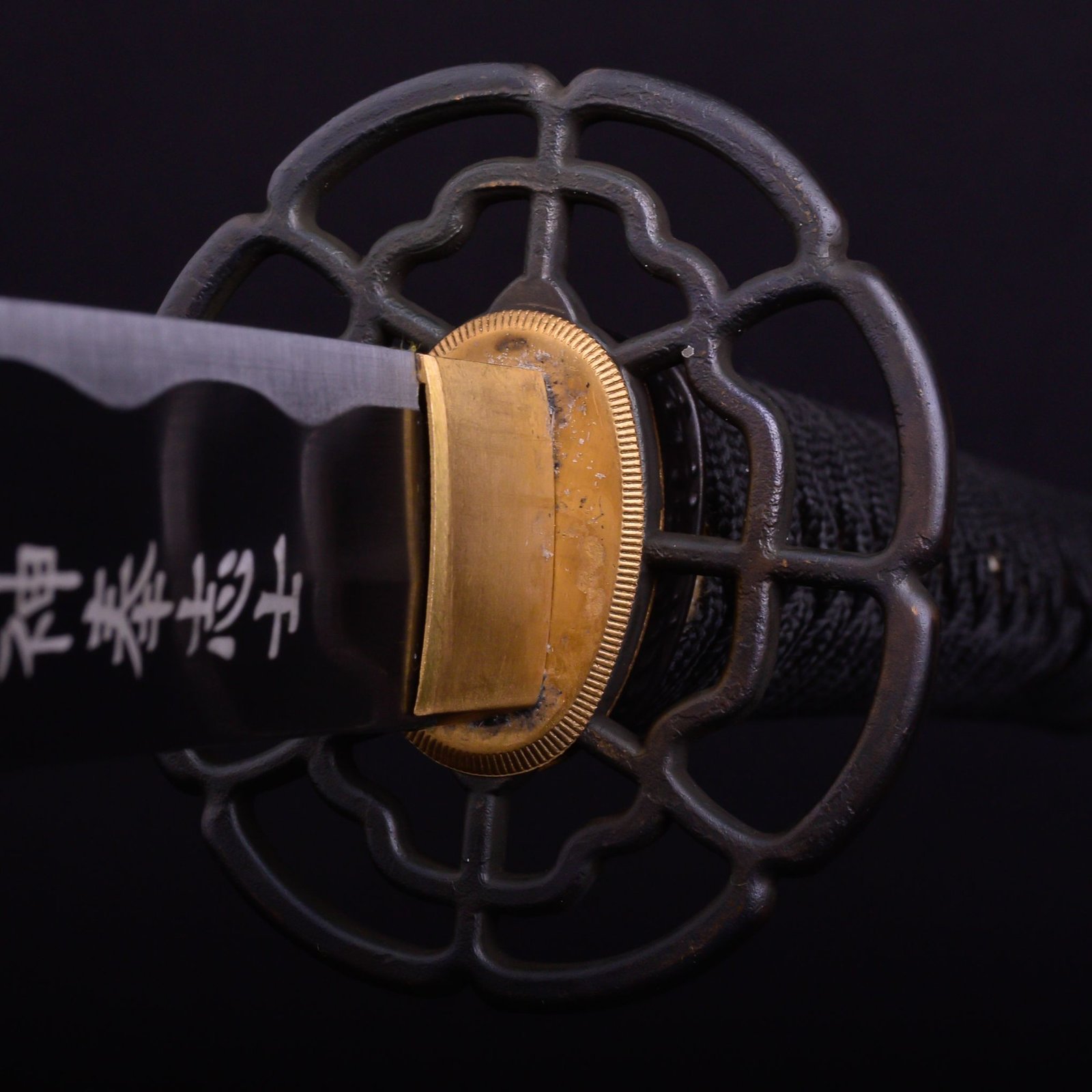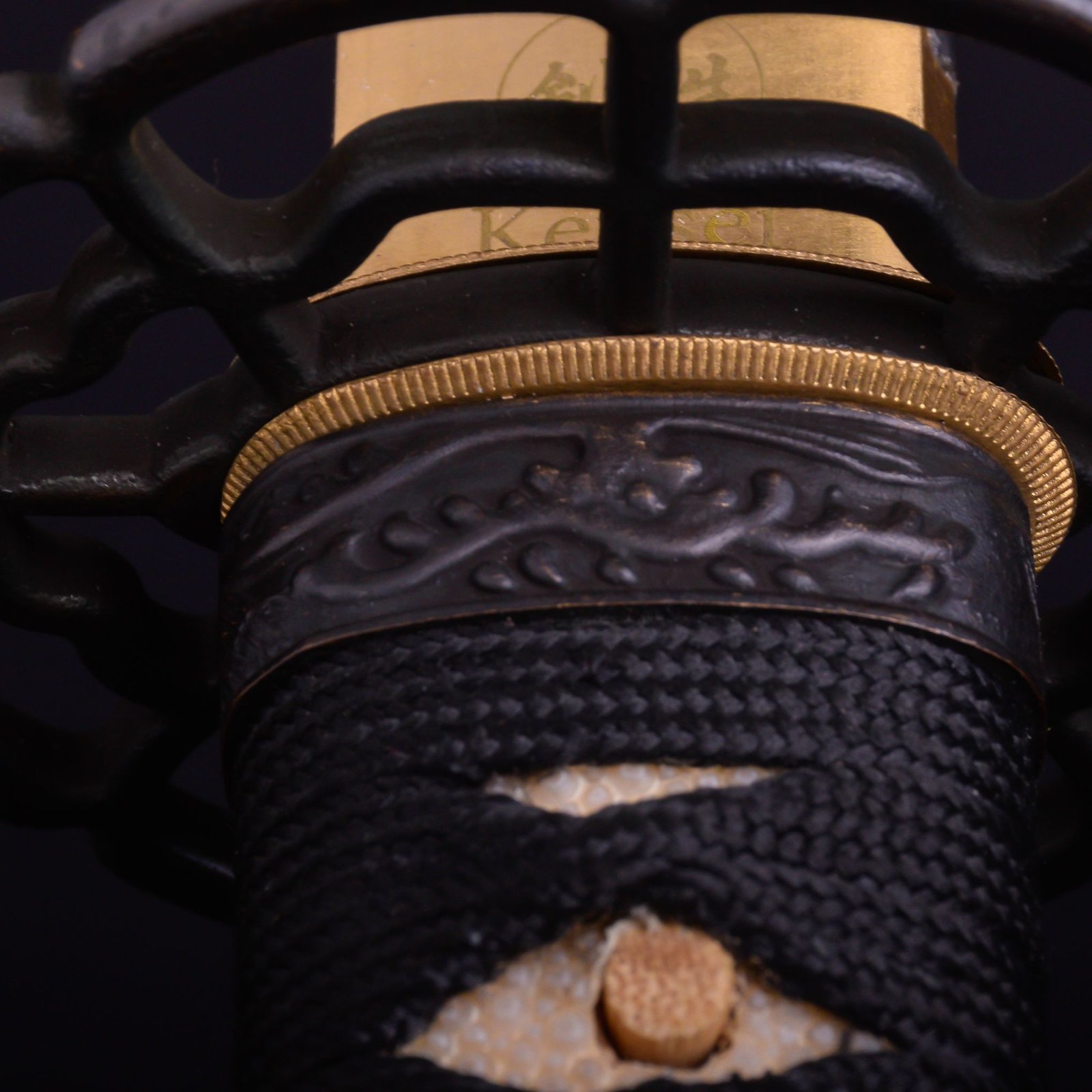 La hoja, forjada en acero al carbono templado al aceite, presenta una lectura visual limpia y clásica, sin bohi, reforzando su carácter tradicional. La construcción de espiga completa y el uso de materiales reales aportan peso simbólico y sensación de autenticidad incluso en reposo.