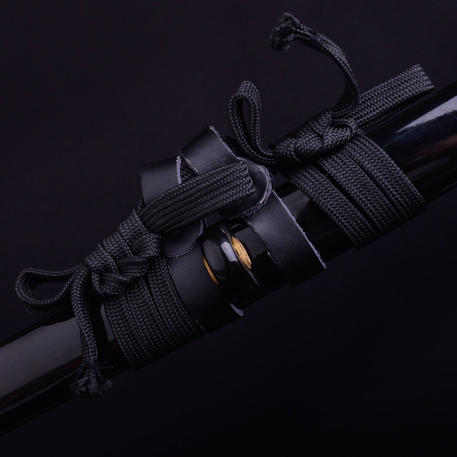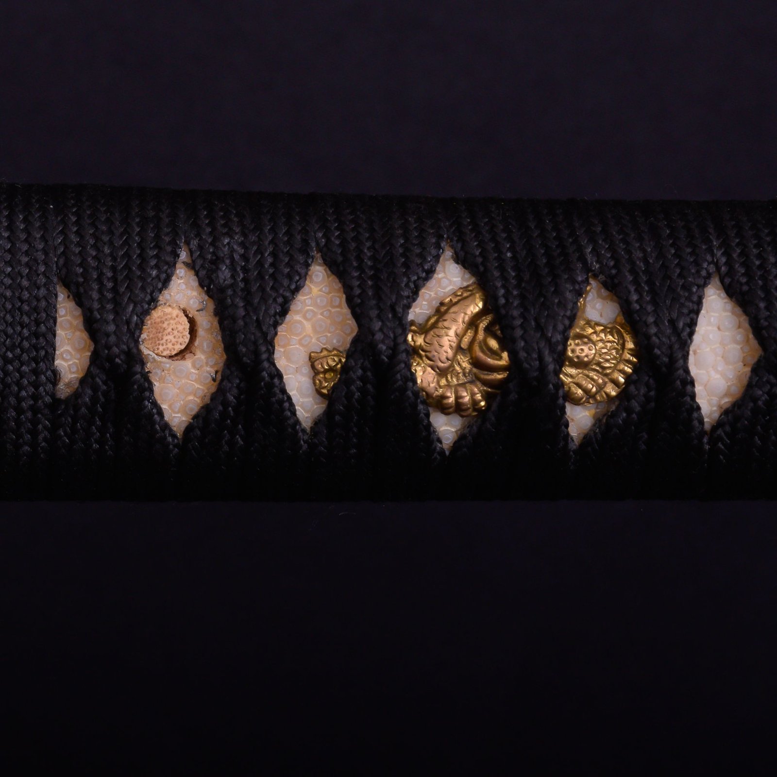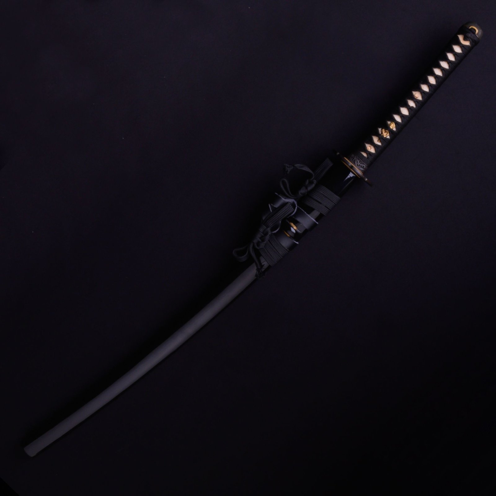 La hoja, forjada en acero al carbono templado al aceite, presenta una lectura visual limpia y clásica, sin bohi, reforzando su carácter tradicional. La construcción de espiga completa y el uso de materiales reales aportan peso simbólico y sensación de autenticidad incluso en reposo.