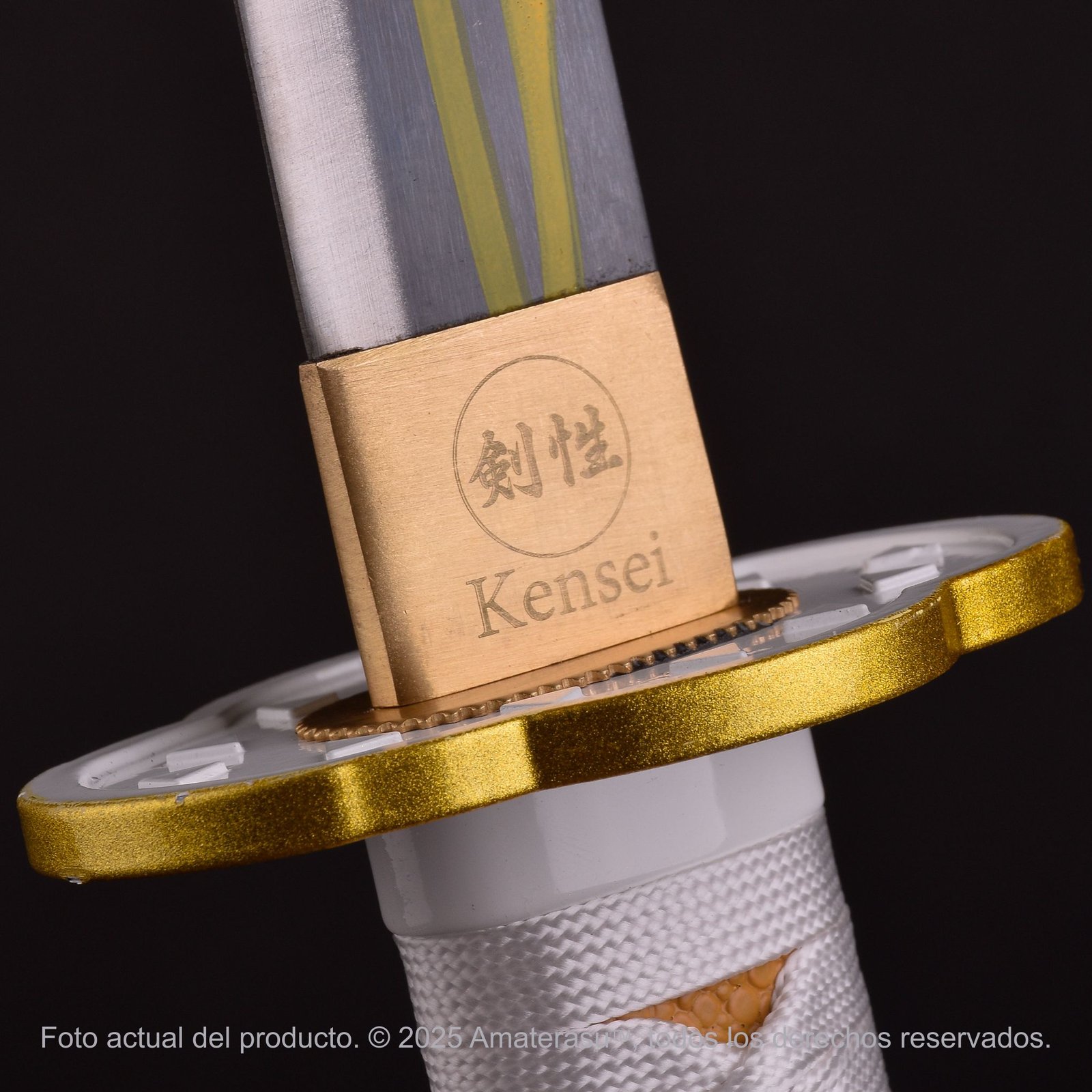 La tsuka en same ecológico amarillo y el ito en seda ecológica refuerzan la coherencia cromática, creando una pieza equilibrada pero intensa, fiel al espíritu del personaje.