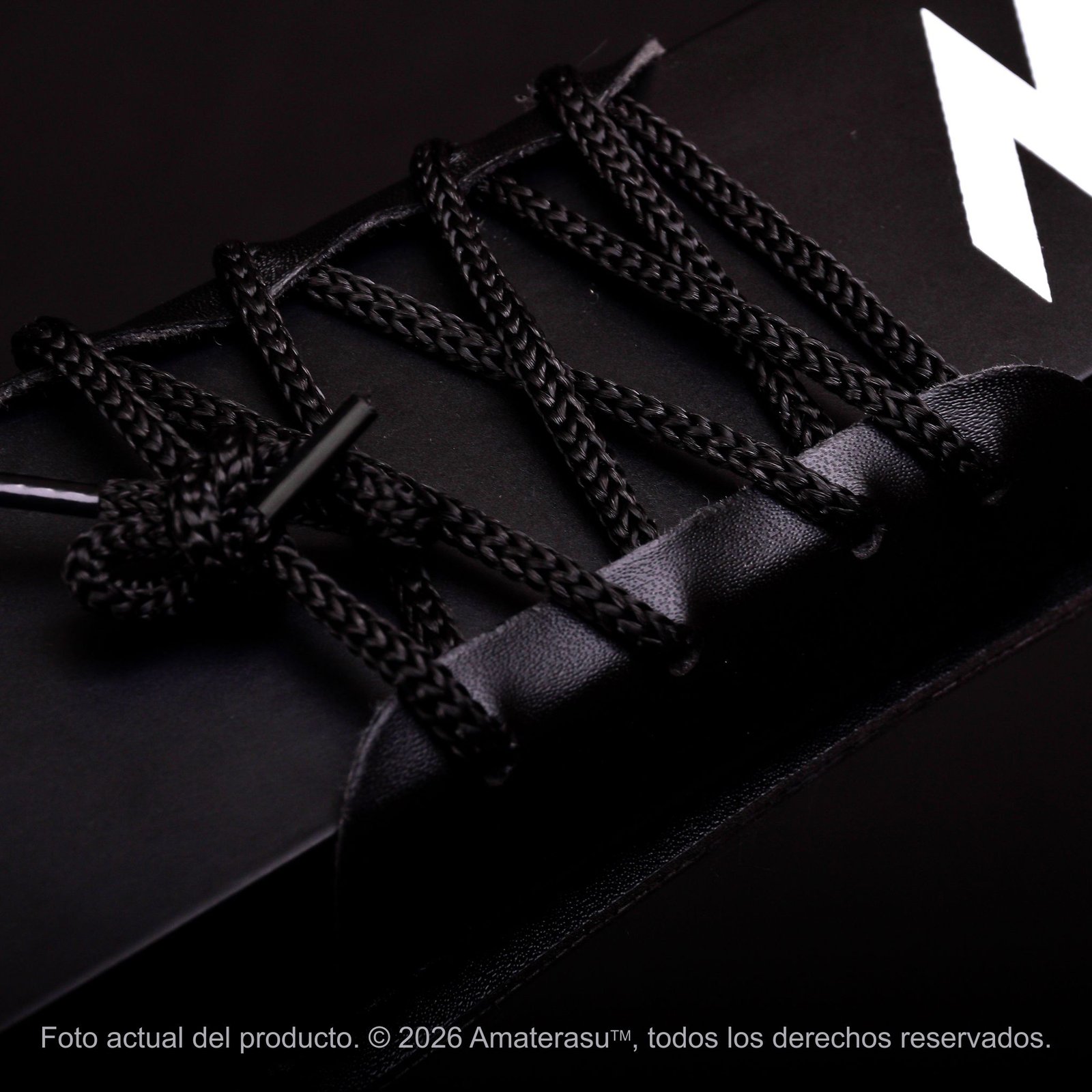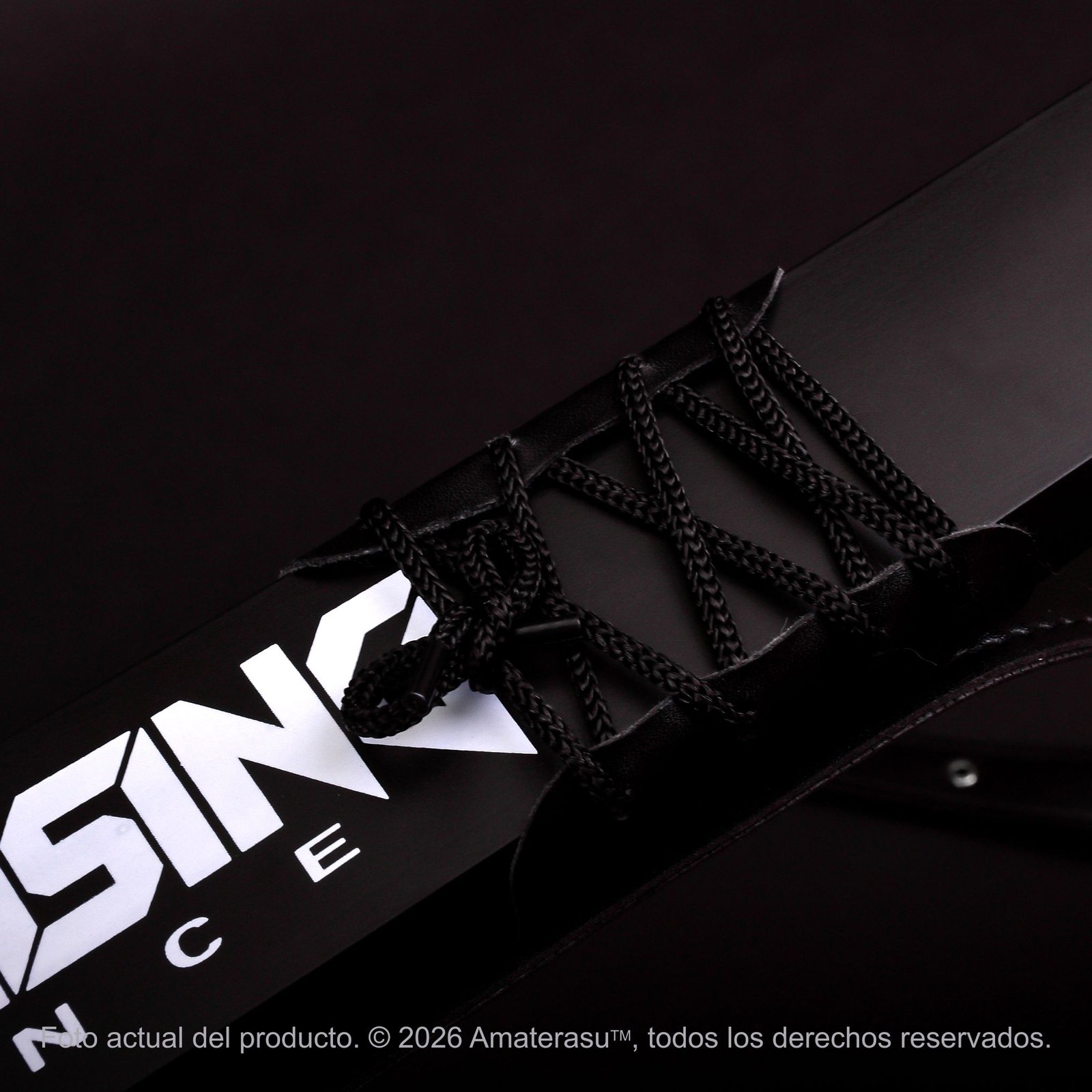 La tsuka de acero aporta peso, solidez y una sensación mecánica coherente con el diseño futurista del arma. La saya de madera laqueada mate equilibra el conjunto con un acabado sobrio, mientras que el tahalí incluido permite su exhibición o porte escénico, reforzando su identidad visual.