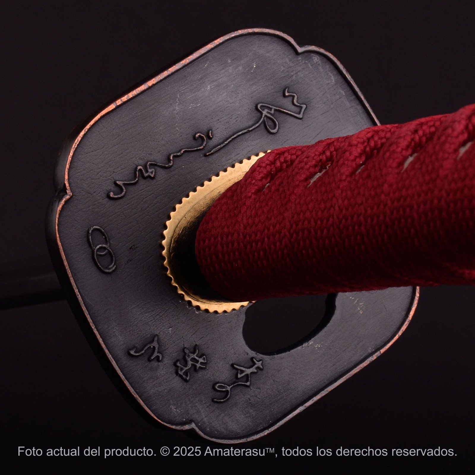 La tsuba en latón grabada con motivo inspirado en la ceremonia del té no es un adorno casual: funciona como núcleo conceptual de la pieza. Allí está la idea que la define: respeto por el ritual, belleza contenida, forma con significado.