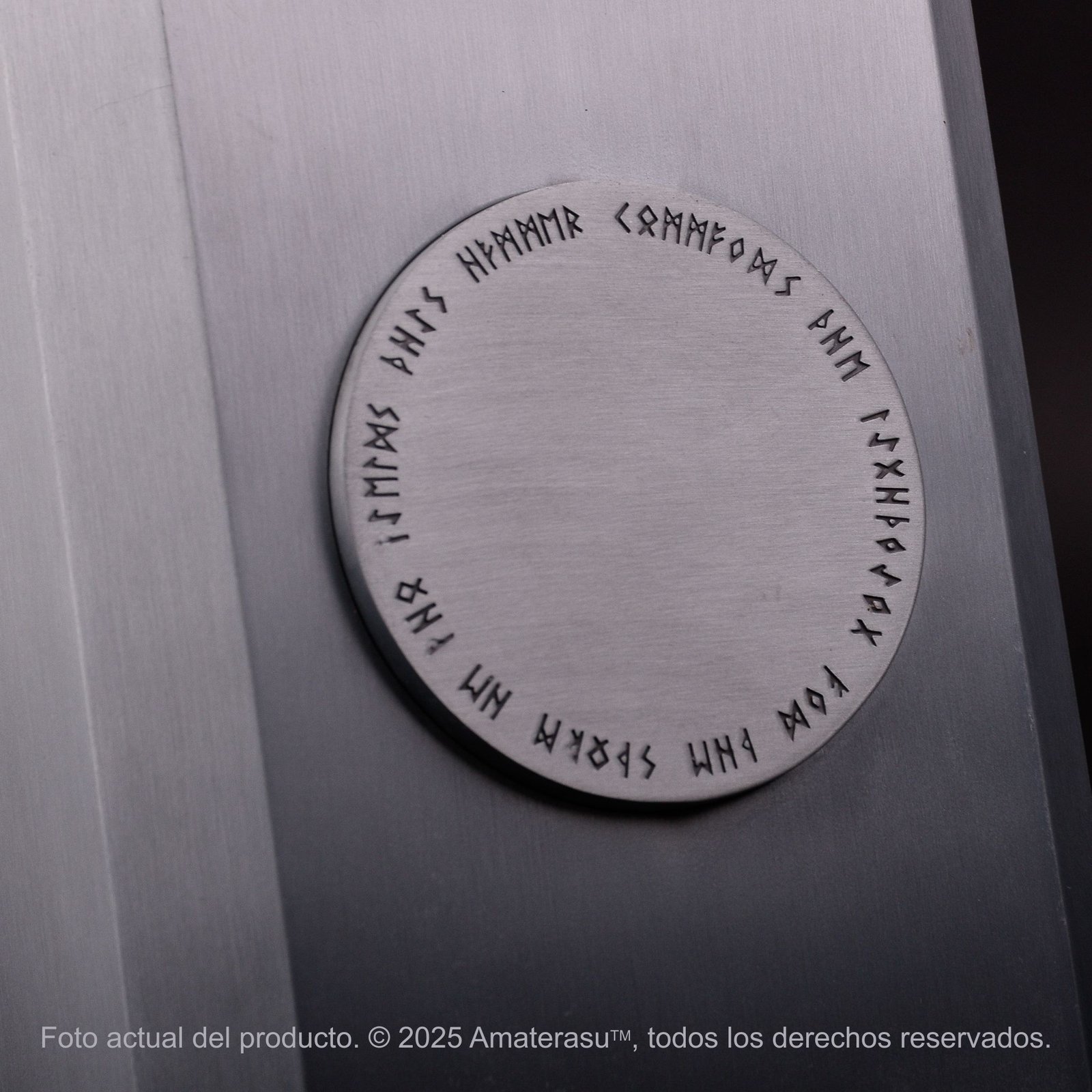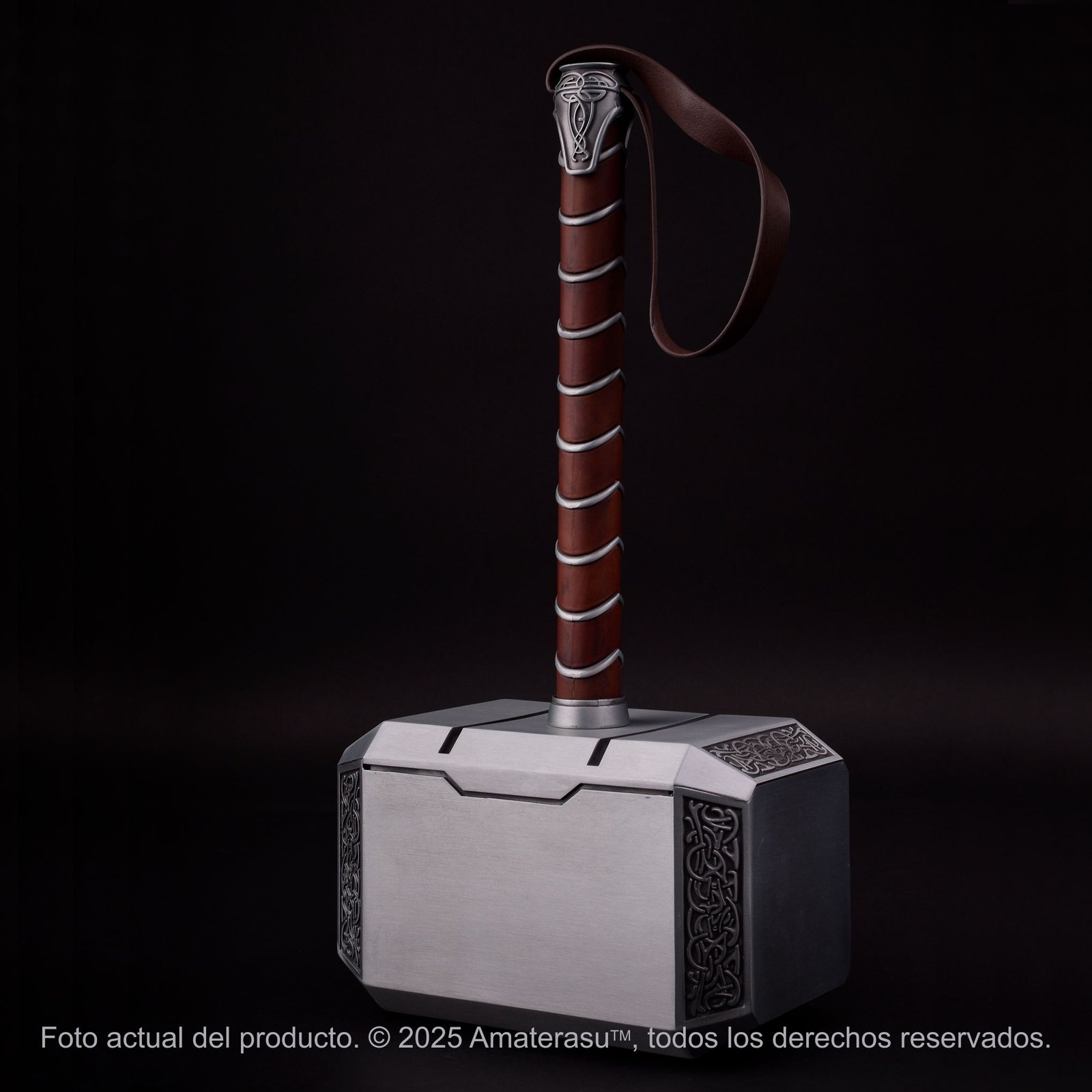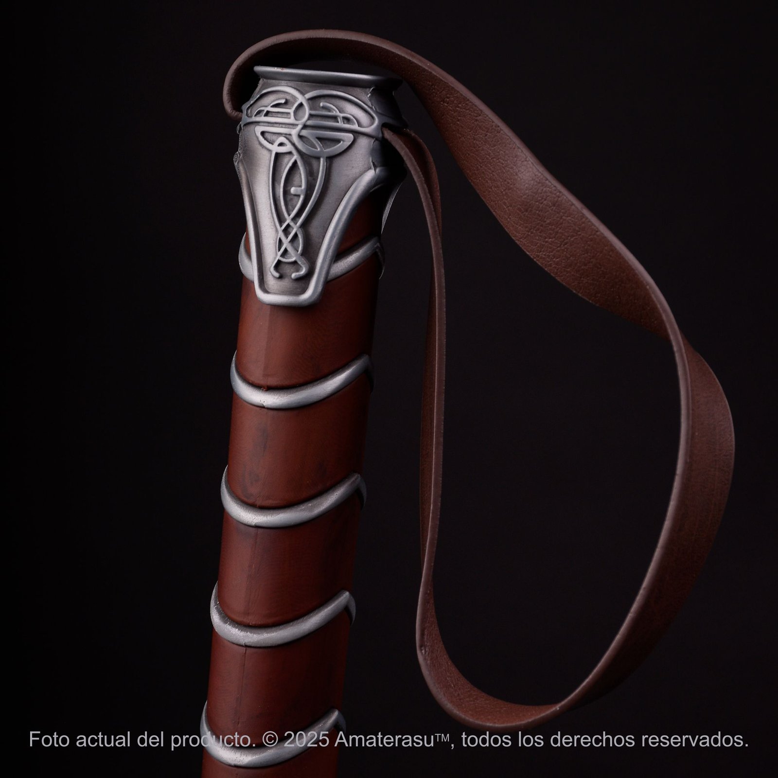 Los detalles han sido cuidados al milímetro: desde los intrincados grabados de nudos nórdicos que cubren las caras y los bordes del martillo, hasta el símbolo Triquetra en el pomo. La empuñadura cuenta con un núcleo de zinc y un acabado en caucho que emula el agarre de cuero texturizado, rematando en una correa de muñeca para mayor fidelidad y seguridad al portarlo.
