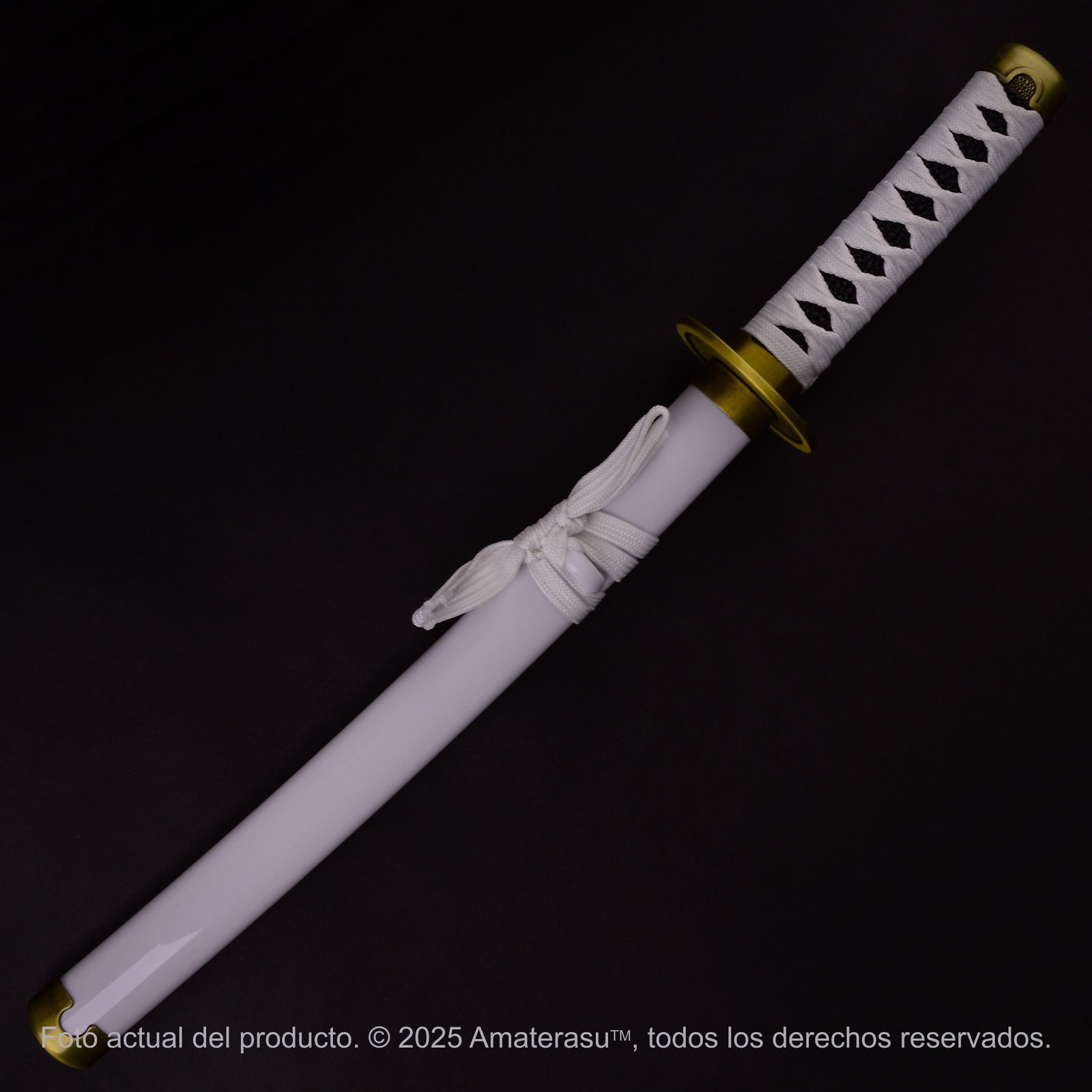 A pesar de su escala reducida, la Wado Ichimonji de Amaterasu ha sido proyectada con materiales técnicos masivos. La Saya (vaina) de madera presenta un acabado blanco laqueado de alta calidad, protegida por un Koiguchi y Kojiri metálicos que aseguran la integridad de la pieza. Su peso equilibrado de 260 g garantiza que, al sostenerla, se perciba la calidad superior de su ensamblaje.