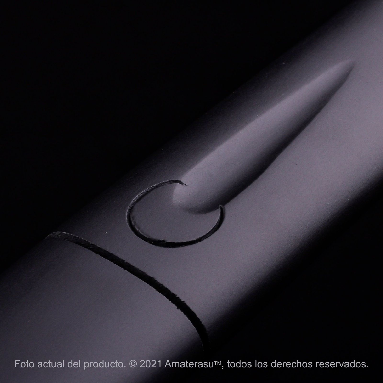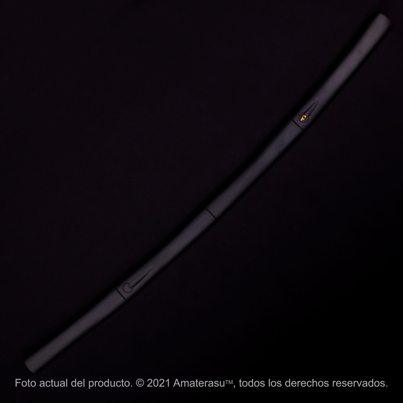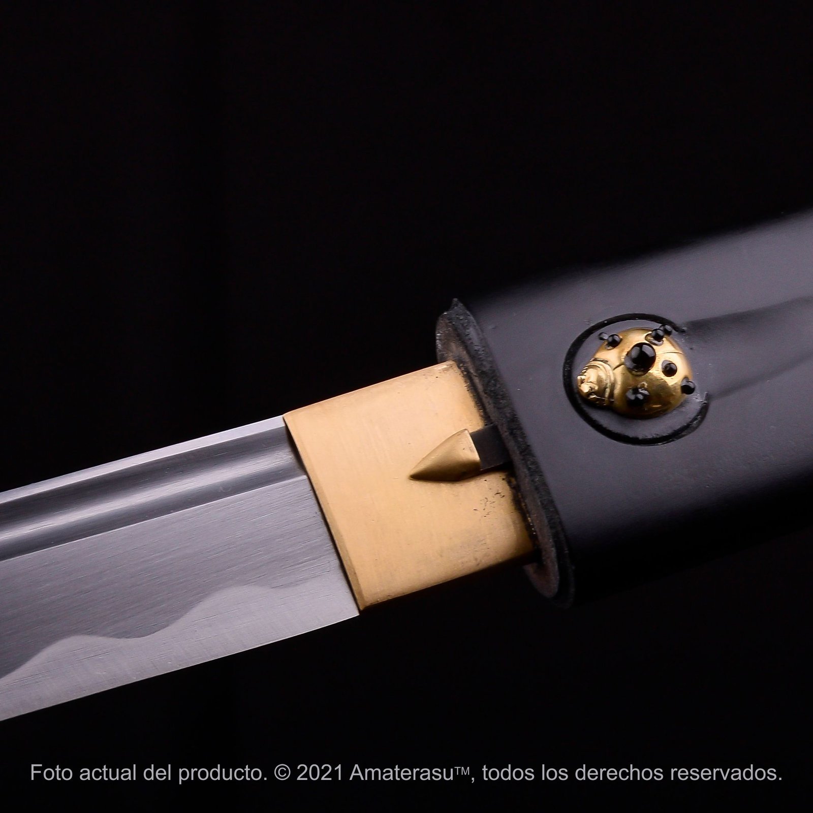 Su diseño prescinde del exceso: líneas limpias, madera laqueada en negro mate y una presencia silenciosa, casi ceremonial. El único acento visual aparece en el adorno de latón con forma de tentōmushi sobre la tsuka: un gesto sutil que transforma toda la pieza.