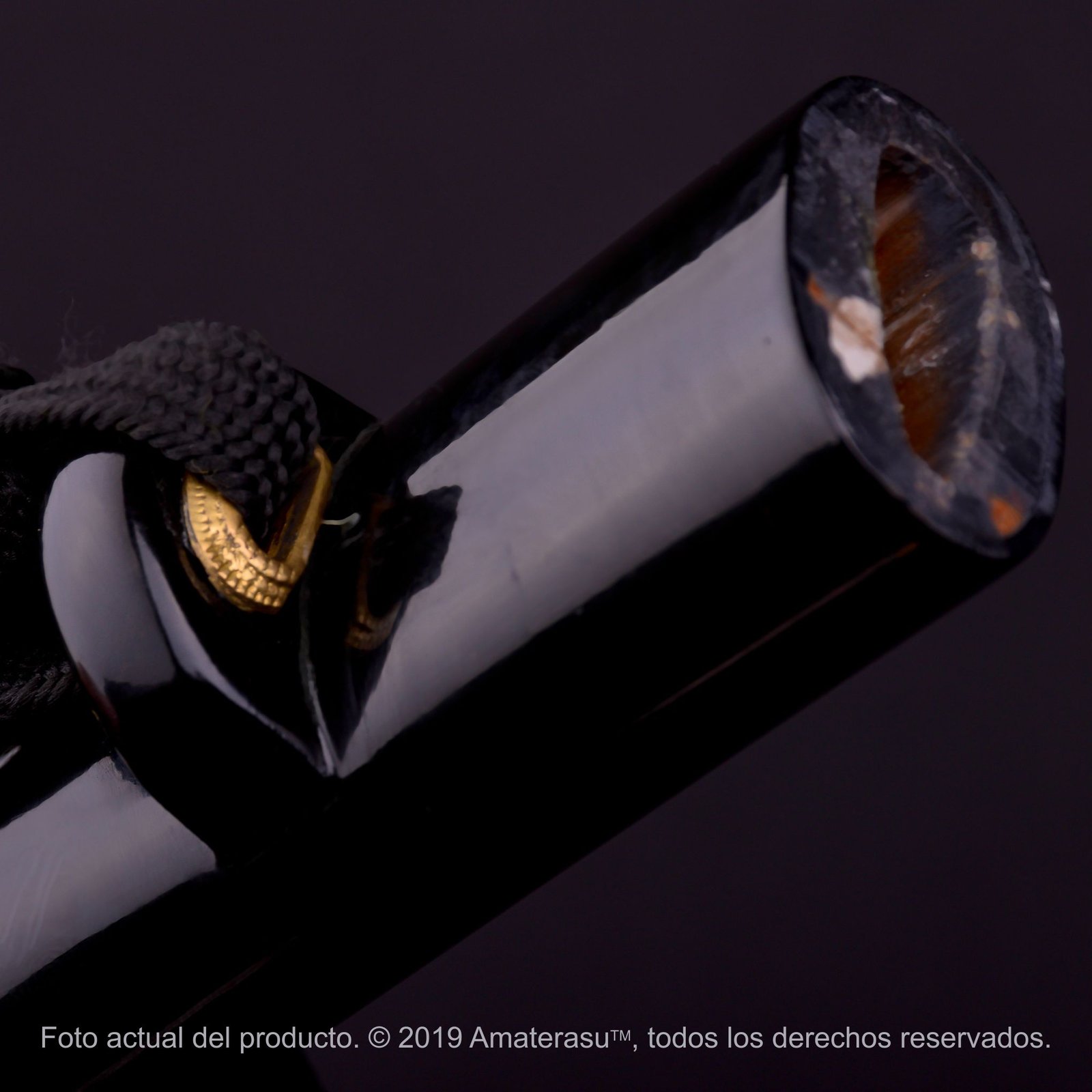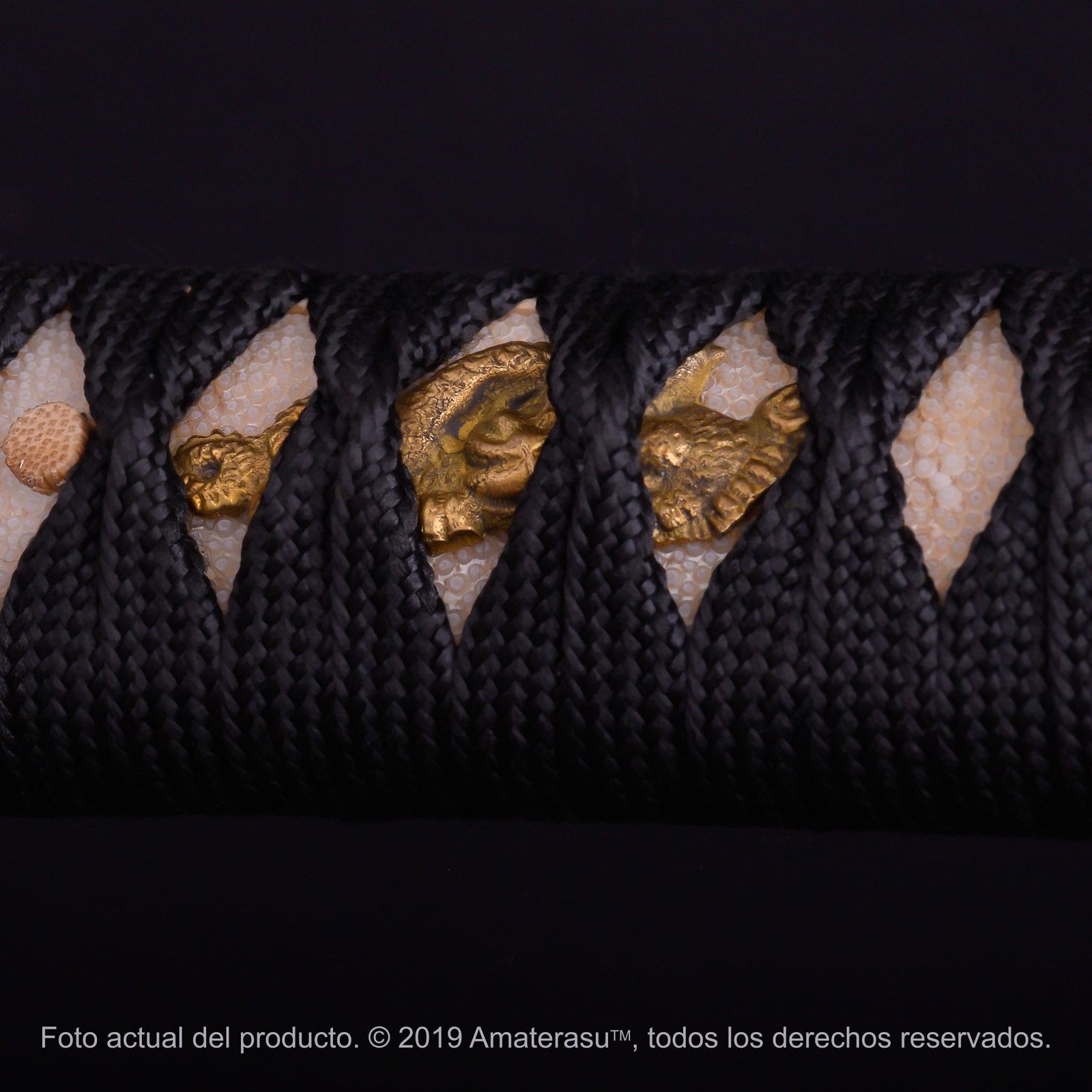 La tsuka, construida en madera dura y revestida en same real con ito de seda ecológica, refuerza el carácter tradicional del montaje. La saya de madera laqueada, decorada con el motivo del tigre y acompañada por sageo, funciona como eje visual de la pieza, convirtiéndola en un objeto de fuerte presencia escénica.