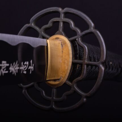 La hoja está forjada a mano en acero al carbono 1060 templado, con geometría triangular (sankaku) y espiga completa, aportando solidez visual y coherencia constructiva. La presencia de filo corresponde a una hoja real de acero, reforzando su carácter como pieza de exhibición con identidad marcial.